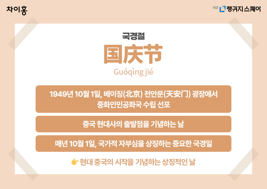 10월 1일은 중국에서 가장 중요한 기념일 중 하나인 국경절 입니다.