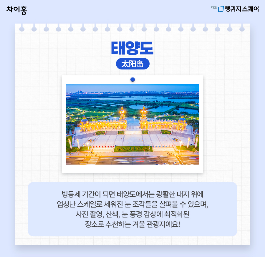 빙등제 시즌에는 대형 눈 조각 전시가 열리는 설경 명소입니다.