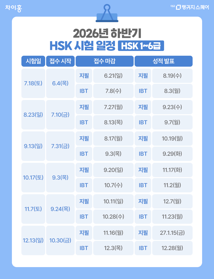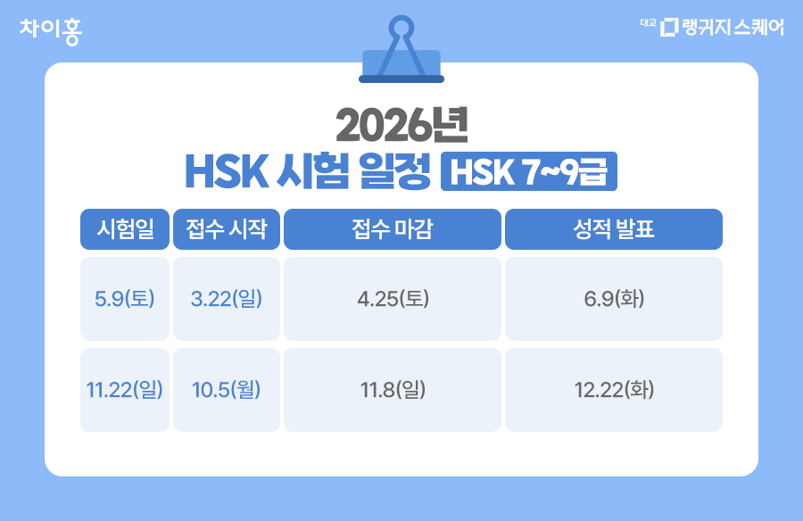 HSK 7급 ~ 9급은 2026년에 2회 진행되며,